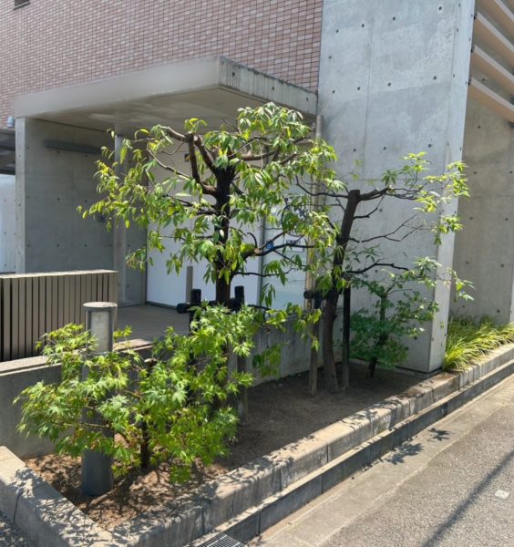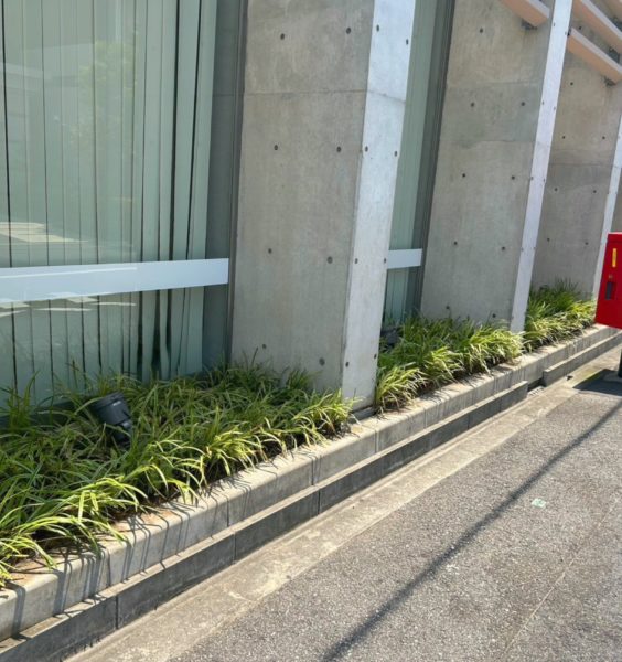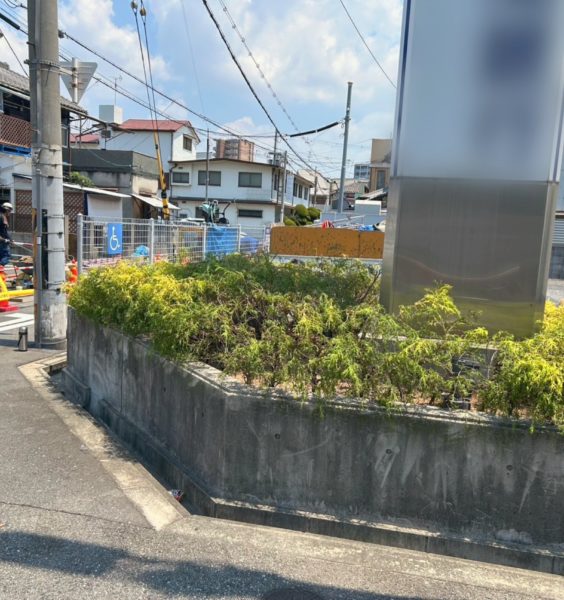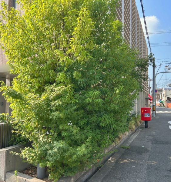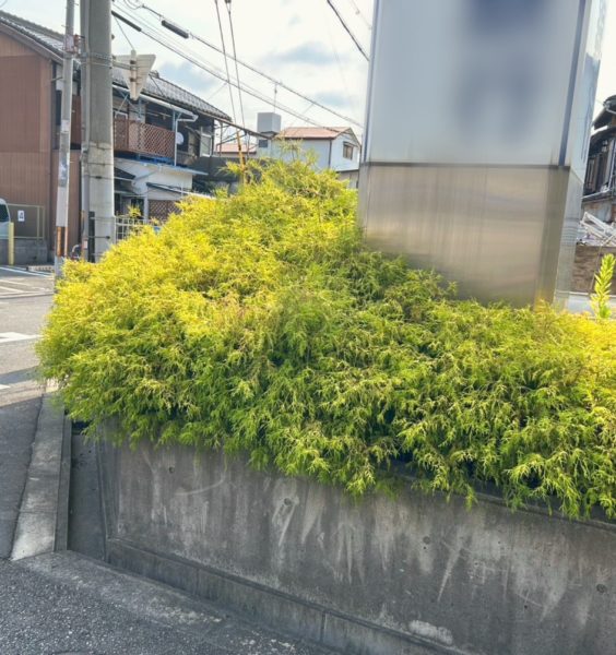 住吉区にて、駐車場の出入り口付近の高木剪定と建物側面のグランドカバーの剪定をさせていただきました。