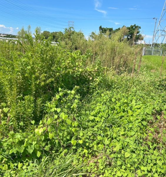 かなり広大な面積の畑でして、腰の高さほどまで伸びた雑草や、つる草が木を覆うように伸びている箇所もありました。