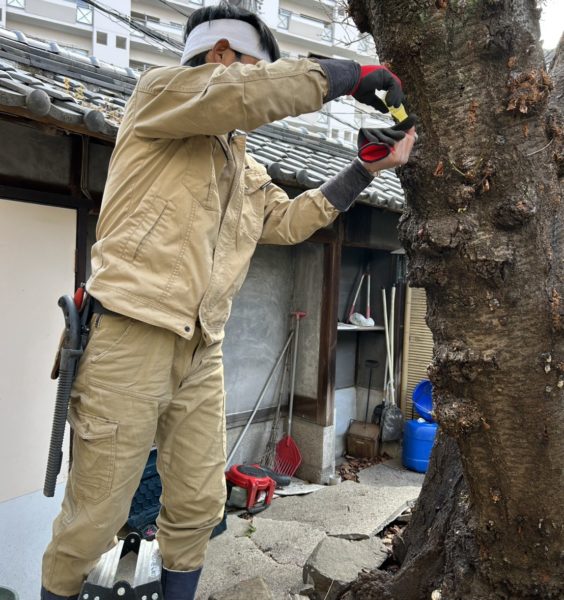 今回は阿倍野区にて施主様のお庭のソメイヨシノ(サクラ)が害虫に被害を受けているとの相談にて、害虫被害の処置を行わせて頂きました。