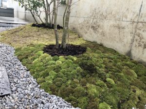 K設計事務所様からのご依頼で、箕面市の新築住宅の庭の植栽工事を行いました。 坪庭は、スナゴケとホソバオキナゴケという2種類の苔を用いて、和風の苔庭となりました。 ホソバオキナゴケは、あざや